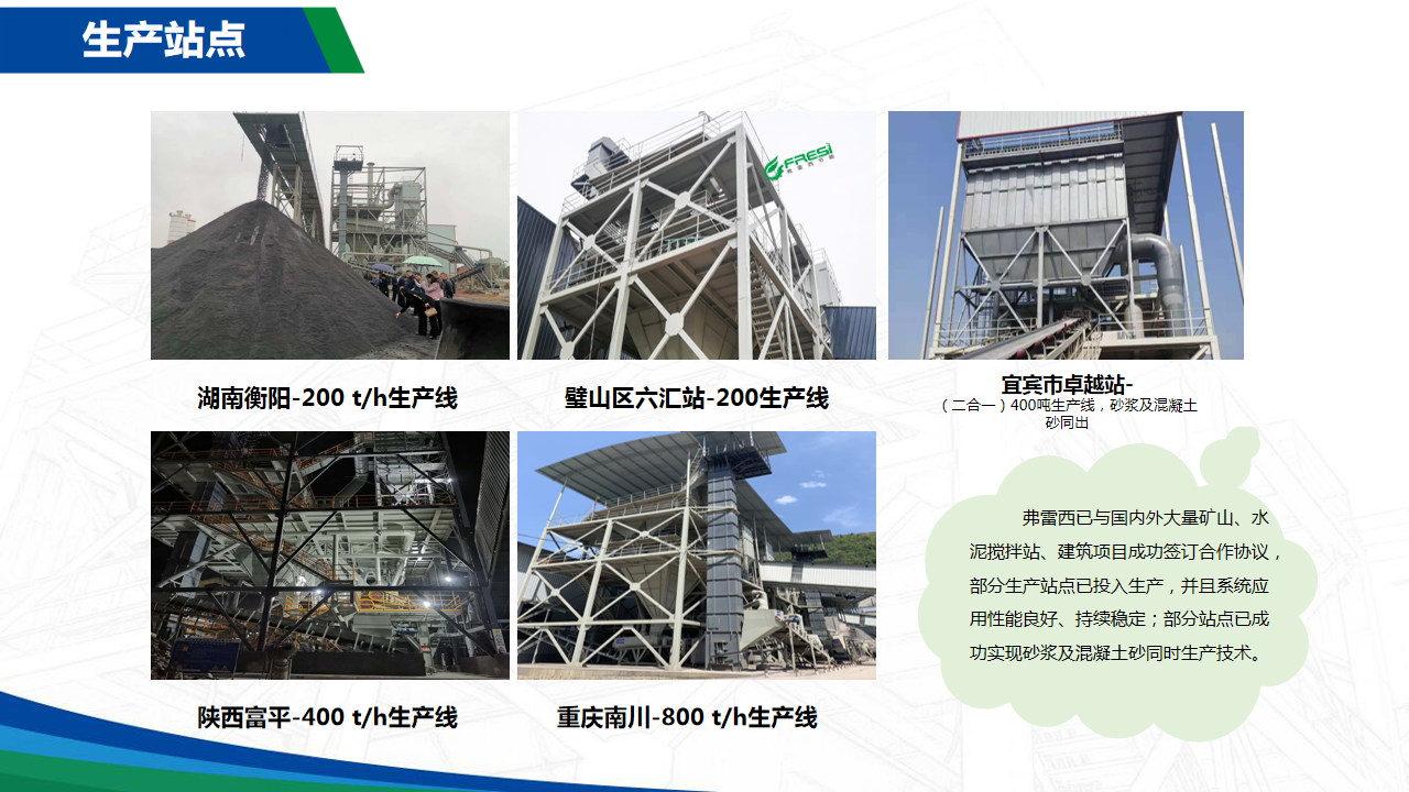目前,弗雷西已与国内外大量矿山、水泥搅拌站、建筑项目等签订合作协议,在重庆、四川、广州、广西、湖南、陕西等地均有生产站点。
