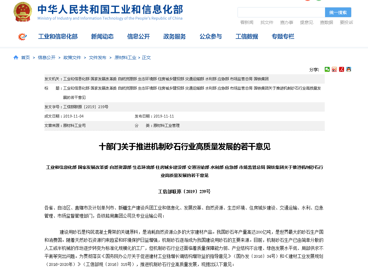 2019年11月4日,国家工信部、发改委、自然资源部等十个部门发布了《十部门关于推进机制砂石行业高质量发展的若干意见》。